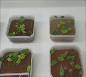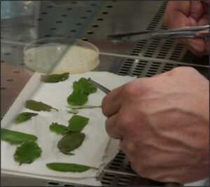 Inundación de muestras de suelo, exposición a cebo vegetal y siembra de partes necrosadas.