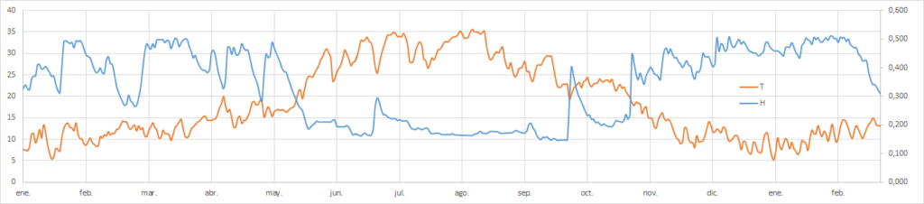El gráfico superior muestra la evolución de la humedad y la temperatura del suelo. La temperatura corresponde a la línea naranja y se mide en el eje de la izquierda en º C. La humedad en color azul se mide en tanto por uno del volumen del suelo ocupado por el agua y se lee en el eje vertical de la derecha.