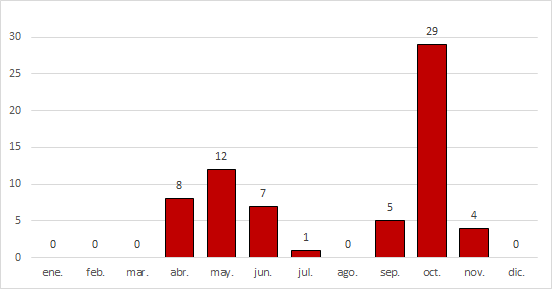 A lo largo de 2025 se observaron 66 días con riesgo de propagación, lo que supone un 18 % del año. En primavera el riesgo está más repartido entre los meses de abril, mayo y junio, con un total de 27 días de alerta en tres meses. En otoño, sin embargo, la propagación se concentra sobre todo en octubre con 29 días en alerta durante el mes. Puede considerarse que los meses de mayo y octubre son los más peligrosos, acumulando el 62 % de los días de alerta registrados en todo el año 2025. El gráfico de la derecha muestra el número de días de alerta de cada mes de 2025.